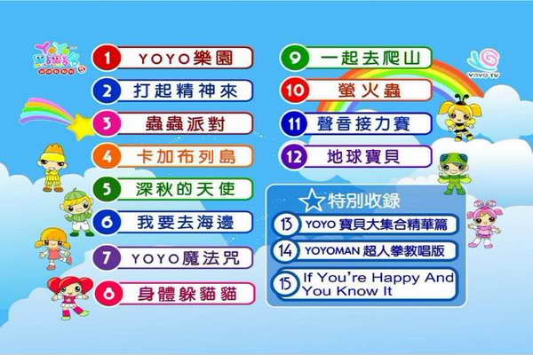 YOYO點點名 5-郊遊點點名 (YOYO樂園 打起精神來 蟲蟲派對 卡加布列島 深秋的天使 我要去海邊 YOYO魔法咒 身體躲貓貓 一起去爬山 螢火蟲 聲音接力賽 地球寶貝 YOYO寶貝 大集合精華篇 YOYOMAN超人拳教唱版 If Youre Happy and You Know It) 繁體中文版 (DVD一片裝)